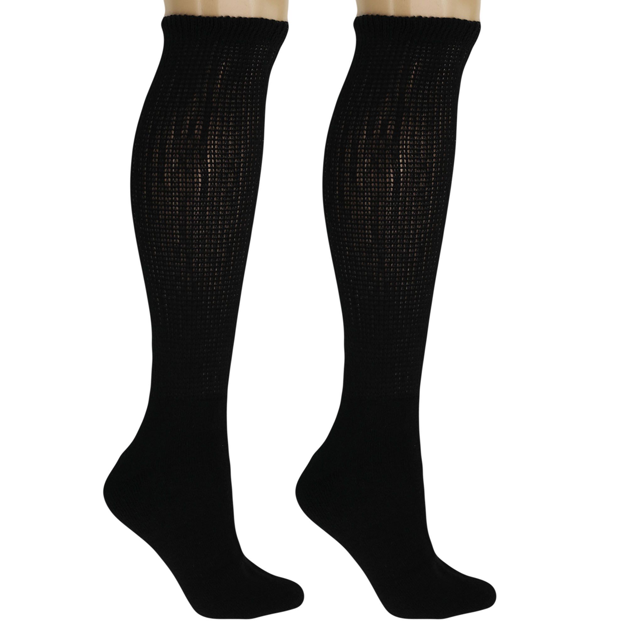 All-Day Comfort & Support: These men's diabetic over-the-calf socks are designed to provide all-day comfort while promoting healthy foot circulation. The extra-wide, non-binding top stays up without squeezing, so it won't restrict blood flow to your legs This gentle fit helps reduce swelling and leg fatigue, keeping your feet and calves comfortable even after long hours. Plush Cushioning & Breathable Fabric: Each sock features a fully cushioned footbed and a smooth toe seam to help prevent blisters and irritation. The soft cotton blend (60% cotton, 35% polyamide, 5% elastane) provides a comfortable, moisture-wicking feel. Cotton adds softness and absorbs sweat, while polyamide adds strength for durability. A special micromesh knit improves airflow to keep your feet dry and odor-free, so you can say goodbye to sweaty, uncomfortable feet. Designed for Every Man: Whether you have diabetes, neuropathy, edema, or simply need a comfortable sock for long days, these over-calf socks deliver relief with a loose-fit, therapeutic design. Three size options accommodate men's shoe sizes from about 5 to 15+, ensuring a snug yet gentle fit for all. The stretchy top can expand to fit wide calves (great for big & tall men) without slipping down or bunching. Everyday Versatility & Easy Care: The classic black color and over-the-calf length make these socks suitable for any occasion, from office wear to workouts. The high-quality knit resists wear and maintains its shape and softness through repeated use. When it's time to clean them, simply toss these socks in the washing machine and tumble dry low. They're built to last and will keep your feet comfortable day after day.
